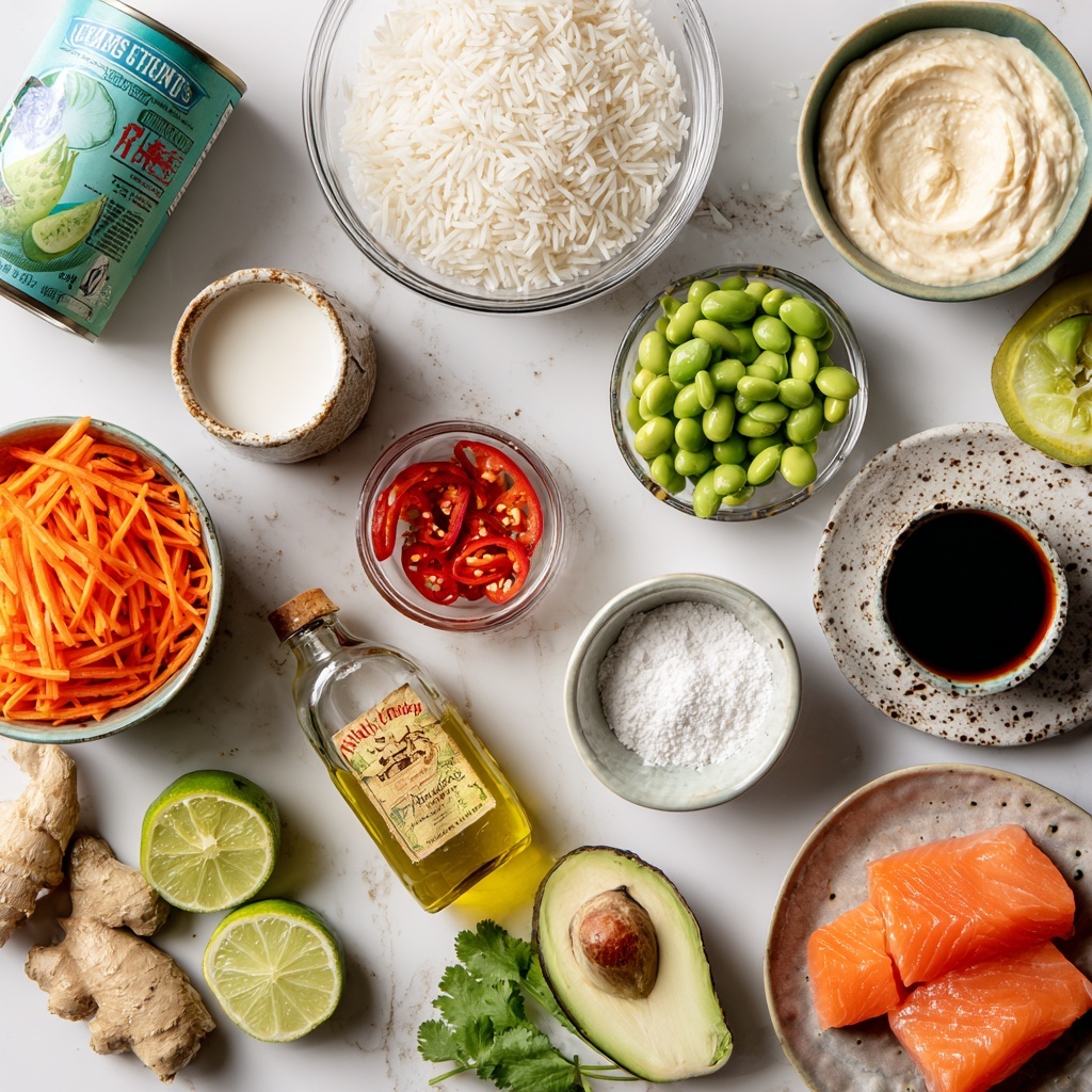 Gathering your ingredients for this recipe is a breeze, and each one plays a vital role in creating the perfect harmony of flavor and texture. From the creamy coconut milk rice to the crisp edamame and avocado, every item is chosen to make each bite exciting and delicious.