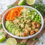 This Bang Bang Salmon Bowls recipe features crispy, marinated salmon cubes coated in a flavorful cornstarch crust and tossed in a spicy-sweet Bang Bang sauce. Served over creamy coconut milk-infused basmati rice and topped with fresh veggies like shredded carrots, edamame, avocado, and cucumber, these bowls are a vibrant and satisfying meal perfect for any day of the week.
