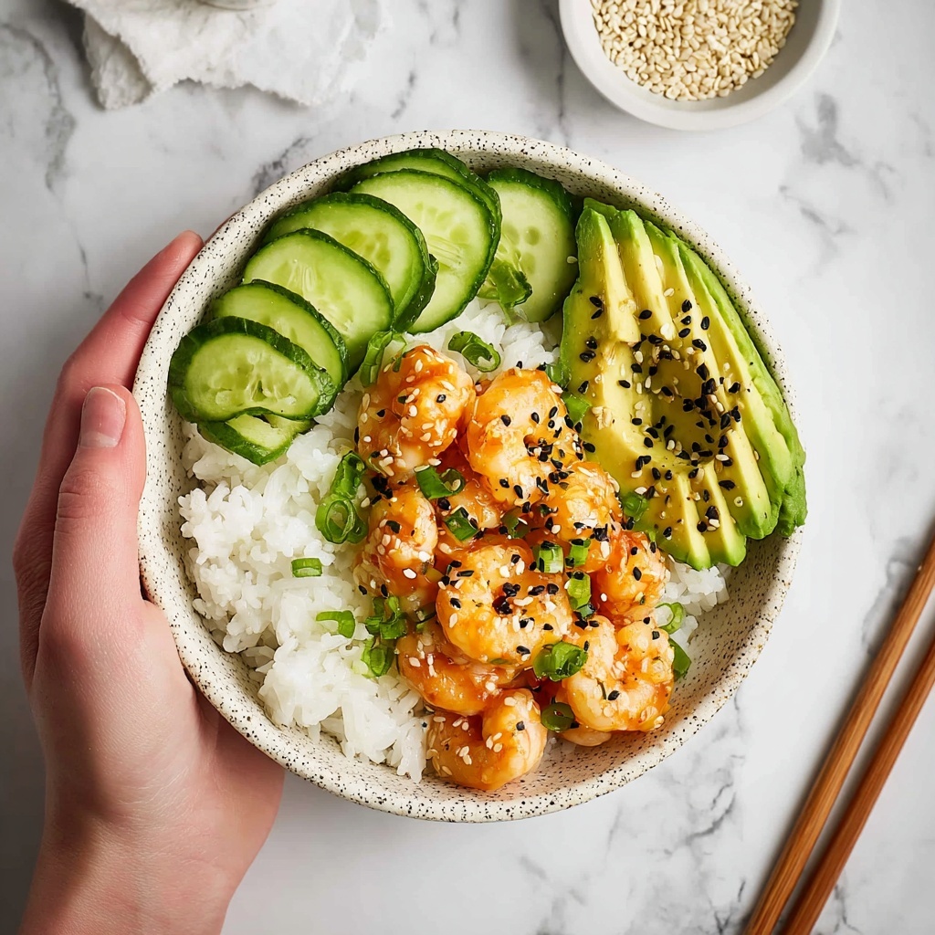 - Assemble the Bowls. Divide the seasoned sushi rice among four bowls. Top each bowl with avocado slices, cucumber, and the sauced shrimp. Garnish with sesame seeds and chopped green onions if desired.