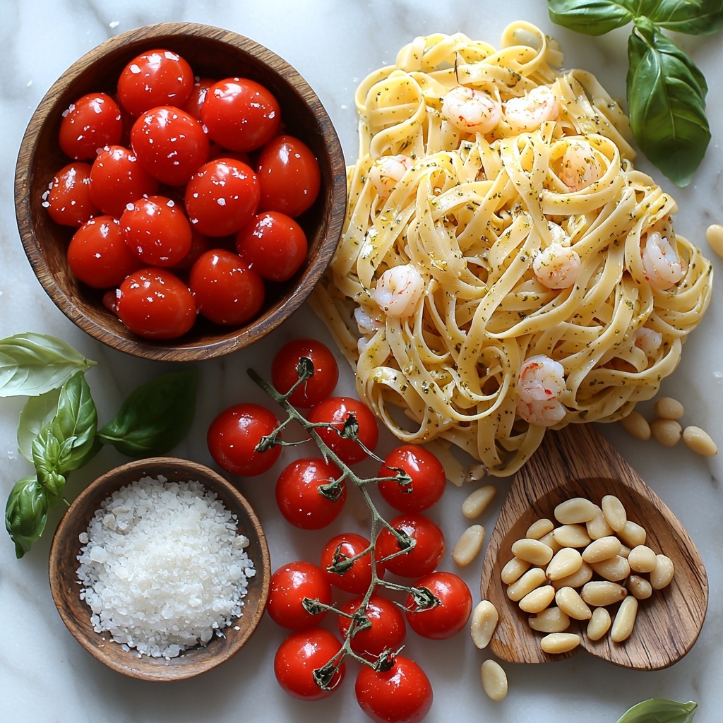 For an impressive presentation, twirl the pasta into neat nests on the plate, then nestle the shrimp artfully on top. Consider serving it family-style in a large shallow bowl where everyone can help themselves to the vibrant roasted tomatoes and silky pesto-coated noodles—it makes sharing feel extra special and inviting.