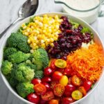 - Combine Salad Ingredients: In a large bowl, mix together the chopped broccoli, 1 cup of sliced cherry tomatoes, corn kernels, grated carrot, and craisins.