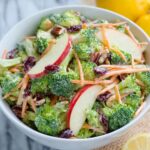 A vibrant and crunchy broccoli salad featuring a creamy lemon dressing, toasted pecans or walnuts, fresh apple, carrot, and dried craisins or raisins. Perfect as a refreshing side dish with a delightful balance of sweet, tangy, and savory flavors.