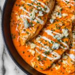 This Cheesy Buffalo Stuffed Chicken recipe features tender chicken breasts stuffed with a creamy blend of cream cheese, buffalo sauce, ranch dressing, shredded cheddar, and chives, then pan-seared to perfection and finished with more buffalo sauce, ranch, and blue cheese. A perfect balance of spicy, creamy, and cheesy flavors makes this dish a crowd-pleaser that’s quick and easy to prepare.