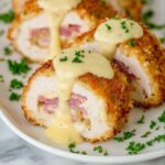 Classic Chicken Cordon Bleu features tender chicken breasts stuffed with savory ham and Swiss cheese, breaded to perfection, pan-fried until golden, and served with a rich Dijon cream sauce. This elegant yet approachable dish makes for a delightful dinner with a creamy, flavorful finish.