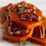 6. Glaze and Continue Baking: Remove the baking sheet from the oven. Spoon about 1 teaspoon of the maple pecan mixture on top of each sweet potato slice. Return the pan to the oven and bake for an additional 10 minutes or until the edges of the sweet potatoes are beautifully caramelized.