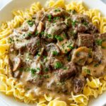 This Classic Beef Stroganoff recipe is a comforting and creamy dish made from scratch using tender strips of beef, sautéed mushrooms, onions, and a rich sour cream sauce. Served over buttery egg noodles, it’s a perfect hearty meal for family dinners or special occasions.