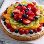 - Arrange Fruit Toppings: Decoratively arrange sliced strawberries, blueberries, raspberries, kiwi slices, mango pieces, and mandarin orange segments over the frosting.