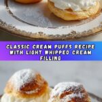 Classic French cream puffs featuring a light and airy choux pastry filled with sweetened vanilla whipped cream and dusted with powdered sugar, perfect for an elegant dessert or a special occasion treat.