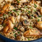 A comforting and flavorful one-pan meal featuring tender seared chicken thighs simmered with mushrooms, fragrant shallots, and garlic, cooked together with white rice in a savory chicken broth and finished with a touch of cream, Parmesan, and fresh herbs.