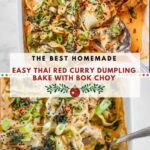 This flavorful Dumpling Bake combines tender shrimp dumplings with a creamy Thai red curry coconut sauce, topped with fresh baby bok choy and garnished with green onions and sesame seeds. Baked to perfection, this comforting and easy-to-make dish offers a delightful fusion of Asian flavors in a convenient one-pan meal.