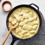 This Homemade Gnocchi recipe produces soft, pillowy potato dumplings perfect for pairing with a creamy pesto sauce. Made from scratch with simple ingredients like Russet potatoes, flour, and egg, these gnocchi are easy to prepare and ideal for a comforting Italian-inspired meal. The dish is finished with a decadent sauce made from pesto, heavy cream, white wine, and Parmesan cheese, making it rich and flavorful.