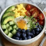 Now comes the fun part—building your bowl! Place the creamy scrambled eggs right in the center of a nice shallow bowl. Surround them with your beautifully sliced avocado, halved cherry tomatoes, crisp cucumber slices, and a generous handful of fresh microgreens for that garden-fresh finish.