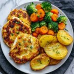 This Crispy Parmesan Crusted Chicken with Roasted Veggies is a flavorful and wholesome meal featuring tender chicken breasts coated with a crunchy Parmesan and panko breadcrumb crust, pan-fried to golden perfection, and served alongside perfectly roasted broccoli, carrots, and baby potatoes. A delicious, balanced, and easy-to-make dish perfect for a family dinner.