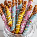 These Easter Pretzel Rods are a delightful and festive treat perfect for spring celebrations. Crunchy pretzel rods are dipped in creamy white chocolate and candy melts, then sprinkled with colorful pastel M&M candies for a fun and sweet snack that’s as visually appealing as it is delicious.