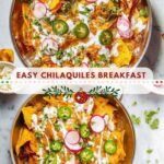 - Serve with Toppings: Plate the chilaquiles and garnish with ½ cup crumbled queso fresco, 2 tablespoons Mexican crema, sliced avocado, jalapeño, onion, radish, chopped cilantro, and the cooked eggs on top for a delicious and colorful presentation.