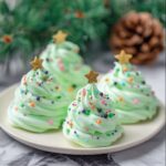 These Christmas Meringue Cookies are light, airy, and sweet treats perfect for holiday celebrations. With a festive touch of green food coloring, gold star sprinkles, and rainbow non-pareils, these delicate cookies add a charming crunch to your dessert table. Baked low and slow, they achieve a crisp exterior with a melt-in-your-mouth texture inside.