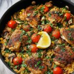 This Greek Chicken and Lemon Rice recipe features juicy, bone-in chicken thighs seasoned with oregano and paprika, seared to perfection, then baked atop a flavorful lemon-infused long-grain rice. The dish offers a harmonious blend of bright citrus, aromatic herbs, and tender chicken, making it a comforting and satisfying Mediterranean-inspired meal.