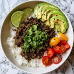 8. Add Toppings: Top the rice with the hot honey ground beef mixture, followed by halved cherry tomatoes, avocado slices, and a sprinkle of fresh cilantro.