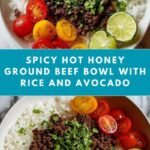 A flavorful Ground Beef Hot Honey Bowl featuring spiced, honey-glazed beef served over rice with fresh cherry tomatoes, avocado, and cilantro. This quick and easy skillet recipe offers a perfect balance of sweet, savory, and spicy flavors in a filling bowl meal.
