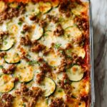 Grease a 9×13-inch casserole dish and arrange half of the zucchini slices in an even layer at the bottom. These vibrant zucchini slices will provide a tender, fresh base that soaks up the delicious beef sauce.