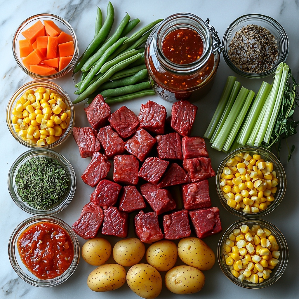 This recipe calls for simple, accessible ingredients that together build layers of flavor and heartiness. Each item plays its part— from the tender beef to the vibrant medley of vegetables, finishing with fragrant herbs that round out the taste beautifully.