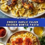 A rich and flavorful Cheesy Garlic Cajun Chicken Bowtie Pasta dish, combining tender seared Cajun-spiced chicken with a creamy Alfredo sauce, fresh garlic, and Parmesan cheese, all tossed with perfectly cooked bowtie pasta. This indulgent meal is garnished with fresh parsley and a touch of heat from red pepper flakes, making it an irresistible dinner option for pasta lovers craving a zesty, cheesy delight.