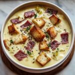 Indulge in a cozy bowl of Creamy Reuben Soup, a rich and comforting blend of savory corned beef, tangy sauerkraut, and creamy Swiss cheese, finished with a hint of Russian dressing and topped with crunchy rye bread croutons. Perfect for chilly nights when you crave the flavors of a classic Reuben sandwich in a warm, hearty soup.
