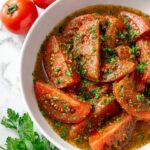 This Marinated Tomatoes recipe features firm roma tomatoes soaked in a flavorful, herb-infused ketchup marinade. The tomatoes are lightly blanched to remove skins, then drenched in a tangy mixture of ketchup, garlic, fresh herbs, and a balanced salt-sugar brine, resulting in a refreshing, vibrant side dish perfect for gatherings or as a complement to grilled meals.