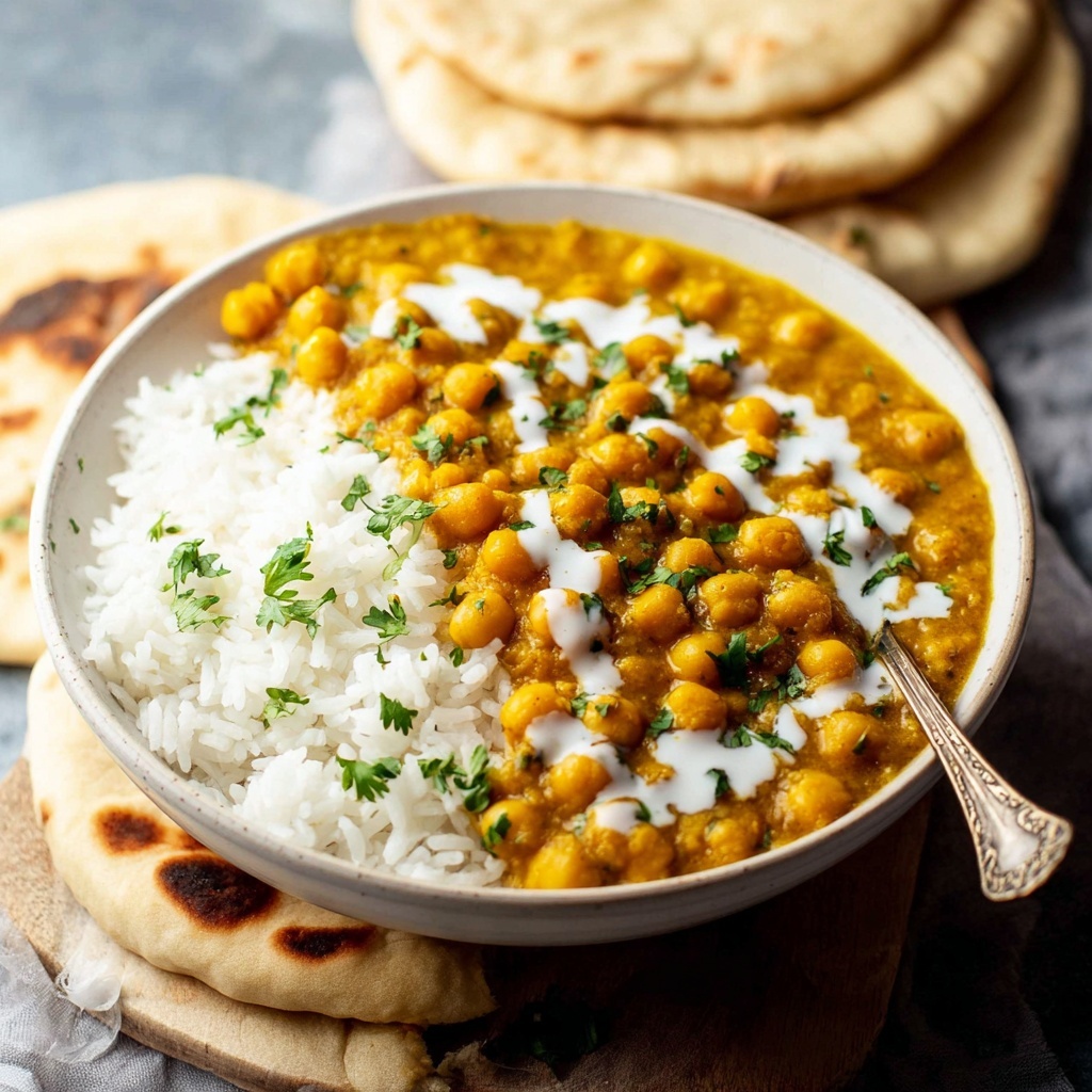 This Melting Afghan Chickpea Curry is a rich, aromatic dish featuring tender chickpeas and red split lentils simmered in fragrant spices and ghee. The curry develops a creamy texture enhanced by baking soda and is served best with fluffy basmati rice and Afghan or other flatbreads, drizzled with yogurt and garnished with fresh coriander. Perfect for a comforting and flavorful meal.