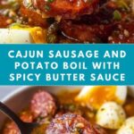 Drain the potatoes, sausage, and corn, then add them along with the peeled eggs into a large mixing bowl. Pour half of the warm butter sauce over everything and toss gently—each piece should be beautifully coated to absorb those deep, spicy flavors.