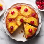 7. Cool and invert: Allow the cake to cool in the pan for about 10 minutes after baking. Then, place a serving plate over the pan and carefully invert it to release the cake with the caramelized pineapple and cherries on top. Serve warm or at room temperature.