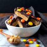 - Top peanut butter layer: Spread the melted chocolate over the peanut butter layer, then sprinkle Reese’s Pieces evenly over the top for a crunchy, colorful finish.