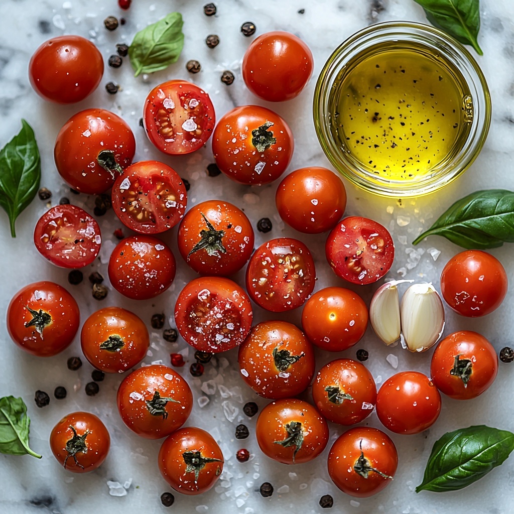 - Prepare the tomatoes: In a large bowl, toss the cherry tomatoes with olive oil, crushed garlic, salt, and black pepper until every tomato is evenly coated with the seasoning.