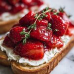 - Assemble the Toast: Spread the whipped ricotta evenly over the toasted bread slices. Spoon the roasted strawberries along with their syrupy juices on top. Garnish with additional thyme leaves for a fresh aromatic finish.