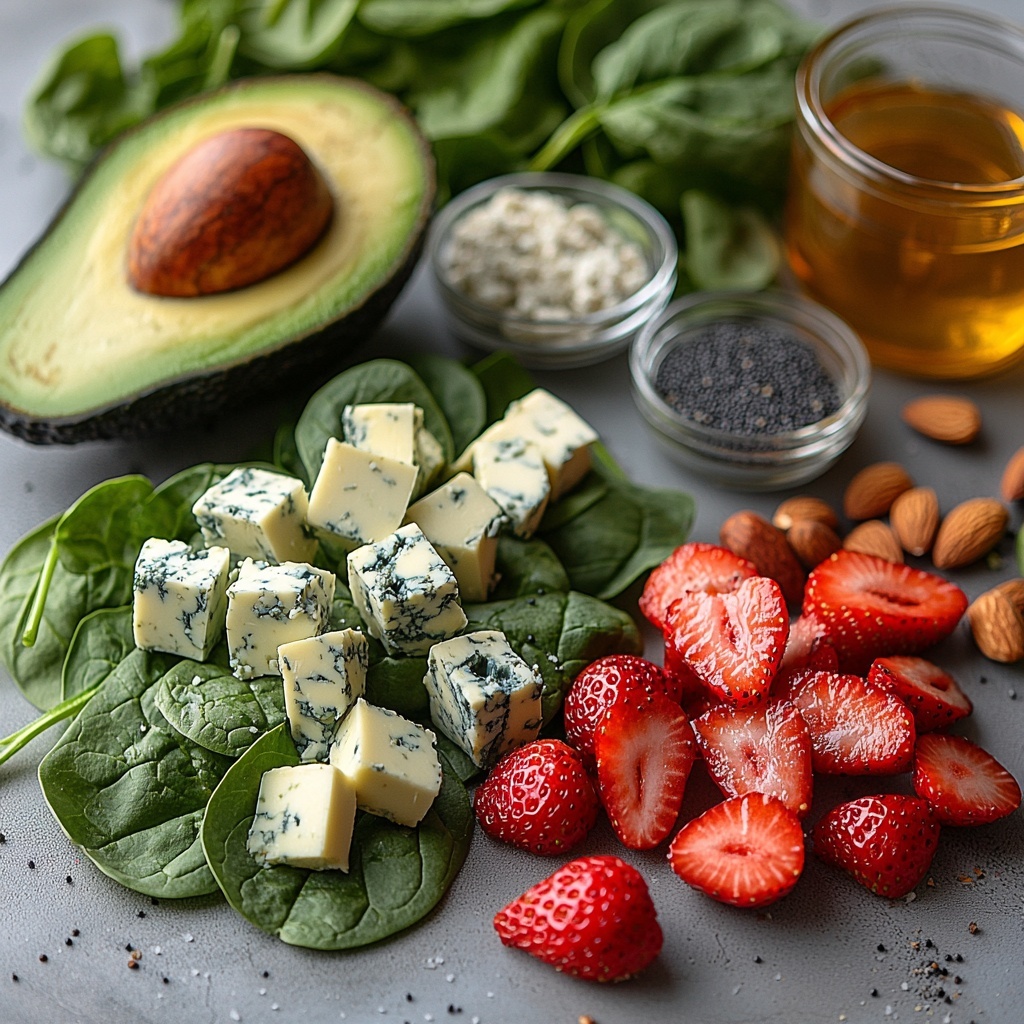 - Combine Salad Ingredients: In a large mixing bowl, add the fresh baby spinach, sliced strawberries, diced avocado, crumbled blue cheese, toasted sliced almonds, and thinly sliced red onion.