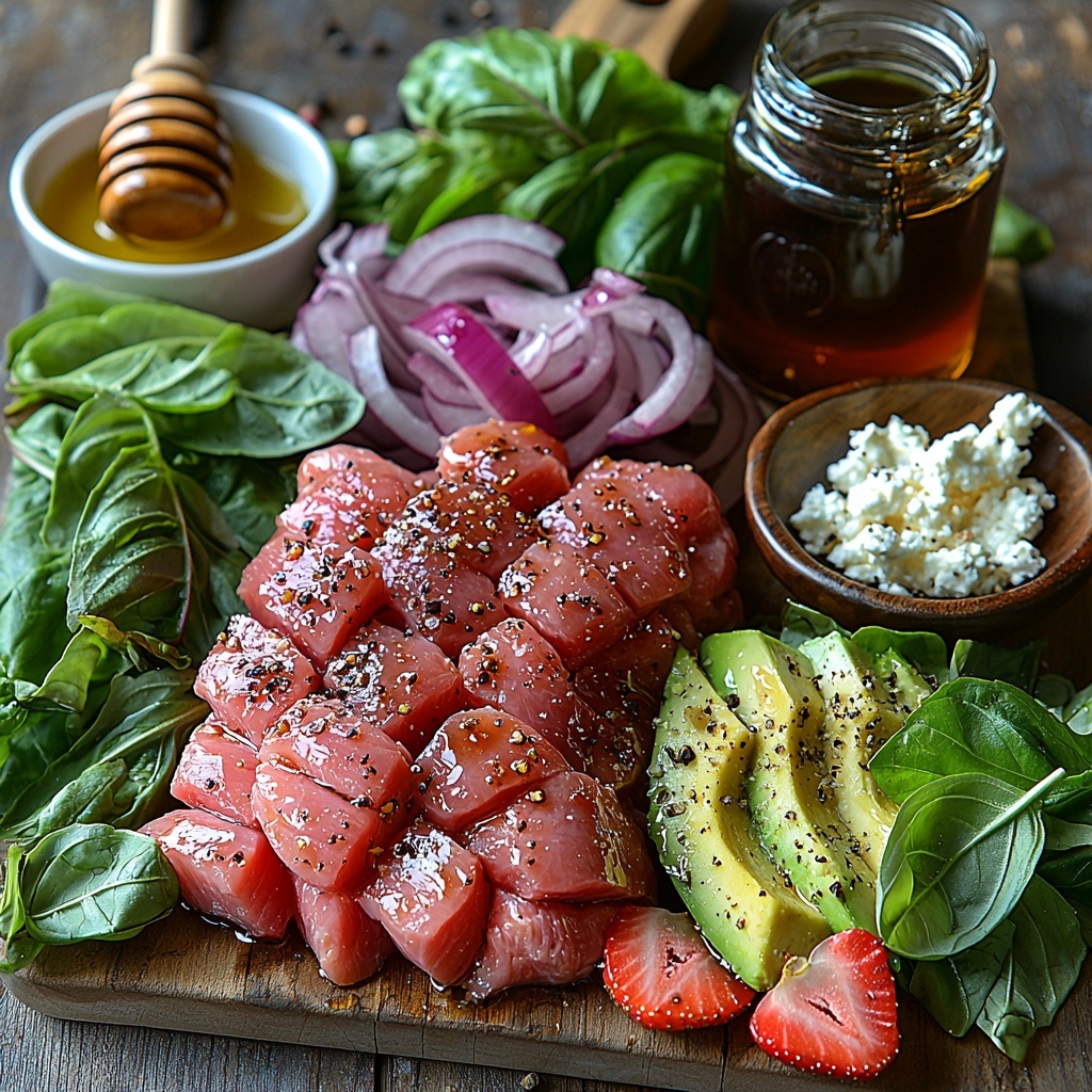 A refreshing and flavorful Strawberry Chicken Salad featuring grilled chicken breasts, fresh mixed greens, ripe strawberries, creamy avocado, candied pecans, red onion, and crumbled feta cheese, all tossed in a vibrant basil balsamic vinaigrette. Perfect for a light lunch or dinner, this salad combines sweet, savory, and tangy elements for a well-balanced and satisfying meal.