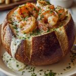 A delicious and hearty stuffed seafood bread bowl featuring a creamy blend of shrimp, lump crab meat, and aromatic vegetables, baked inside a hollowed sourdough loaf for a perfect party appetizer or main course.