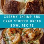 A delicious and hearty stuffed seafood bread bowl featuring a creamy blend of shrimp, lump crab meat, and aromatic vegetables, baked inside a hollowed sourdough loaf for a perfect party appetizer or main course.