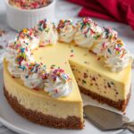 This Sugar Cookie Cheesecake combines a buttery sugar cookie crust with a creamy, rich cheesecake filling studded with colorful sprinkles. Baked to perfection, this delightful dessert boasts a slight jiggle in the center for the ideal texture and is perfect for celebrations or holiday gatherings. Finished with whipped cream and extra sprinkles, it offers a festive and indulgent treat that’s both easy to make and visually appealing.