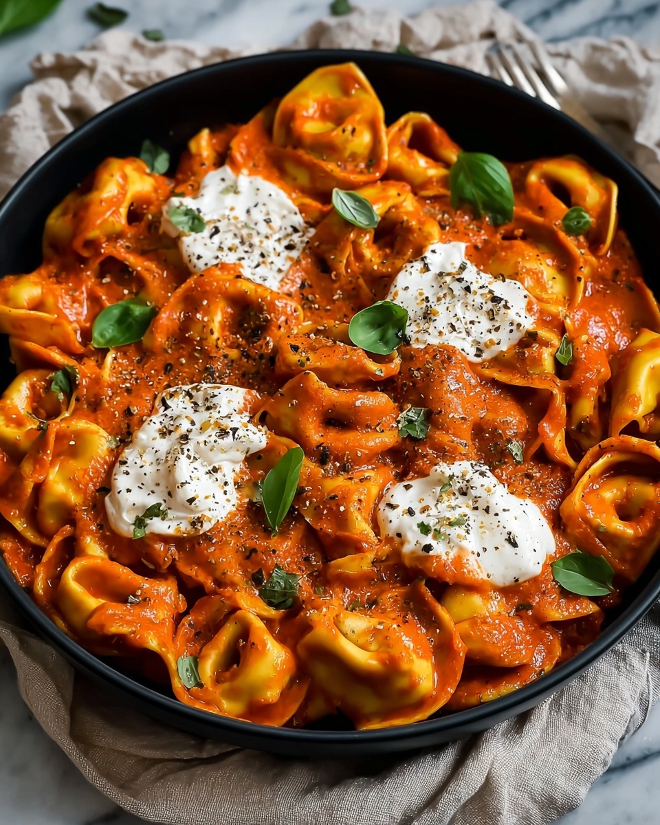 Finally, break apart the burrata over the hot tortellini, letting its creamy, milky treasure melt slightly into the sauce. Sprinkle generously with fresh chopped basil for a fragrant, vibrant finish that brightens the whole plate. Serve immediately while warm, and enjoy every luscious forkful.