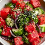 A refreshing and vibrant Watermelon Shiso Salad combining juicy watermelon cubes with aromatic shiso leaves, tangy rice vinegar-lime dressing, and creamy feta cheese. This light and colorful salad is perfect for summer, offering a delightful balance of sweet, tangy, and savory flavors with a hint of herbal freshness.