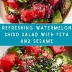 A refreshing and vibrant Watermelon Shiso Salad combining juicy watermelon cubes with aromatic shiso leaves, tangy rice vinegar-lime dressing, and creamy feta cheese. This light and colorful salad is perfect for summer, offering a delightful balance of sweet, tangy, and savory flavors with a hint of herbal freshness.